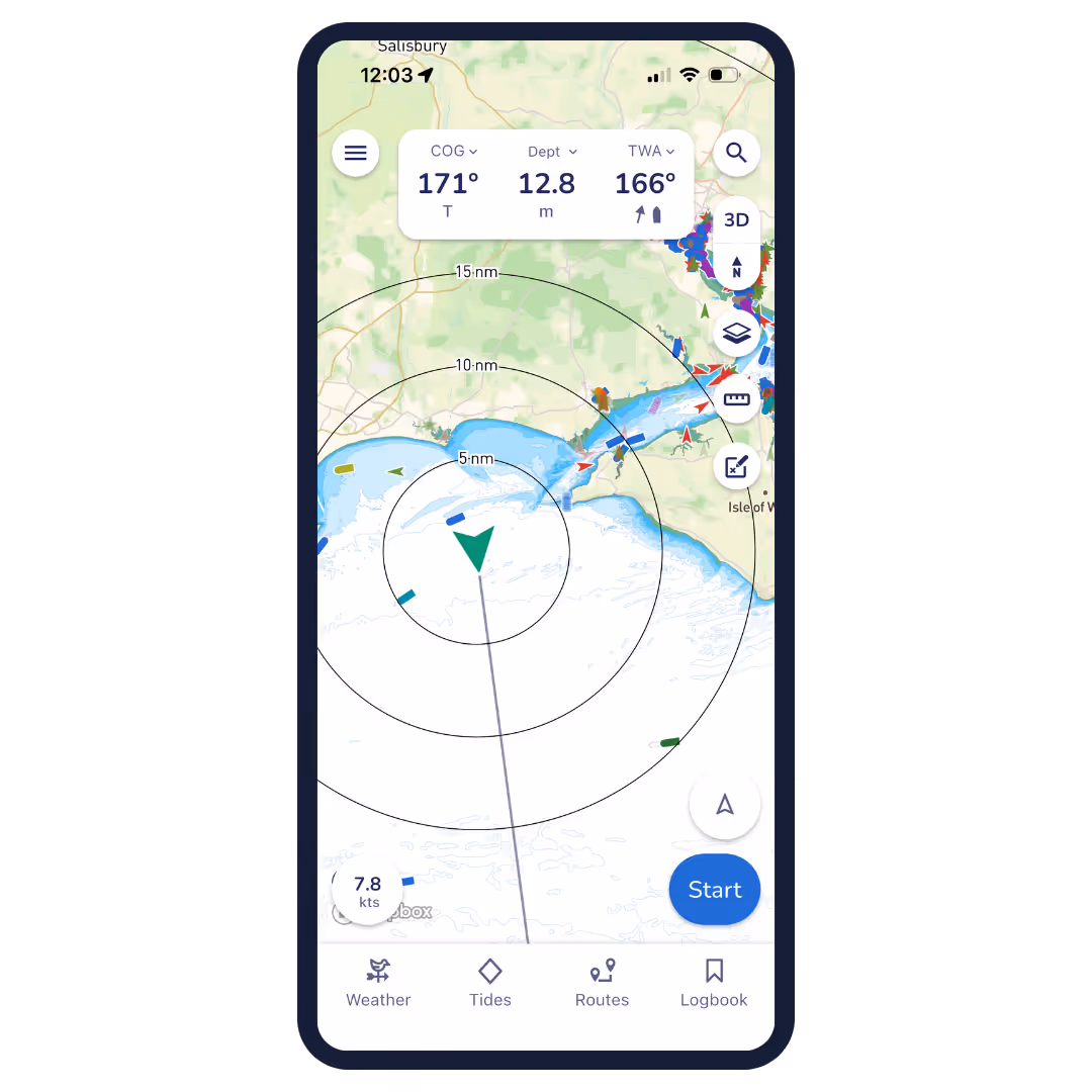 View your live position and check your Course Over Ground (COG) and Speed Over Ground (SOG) in real time. Concentric circles around your position quickly show the distance between you and key features around you.